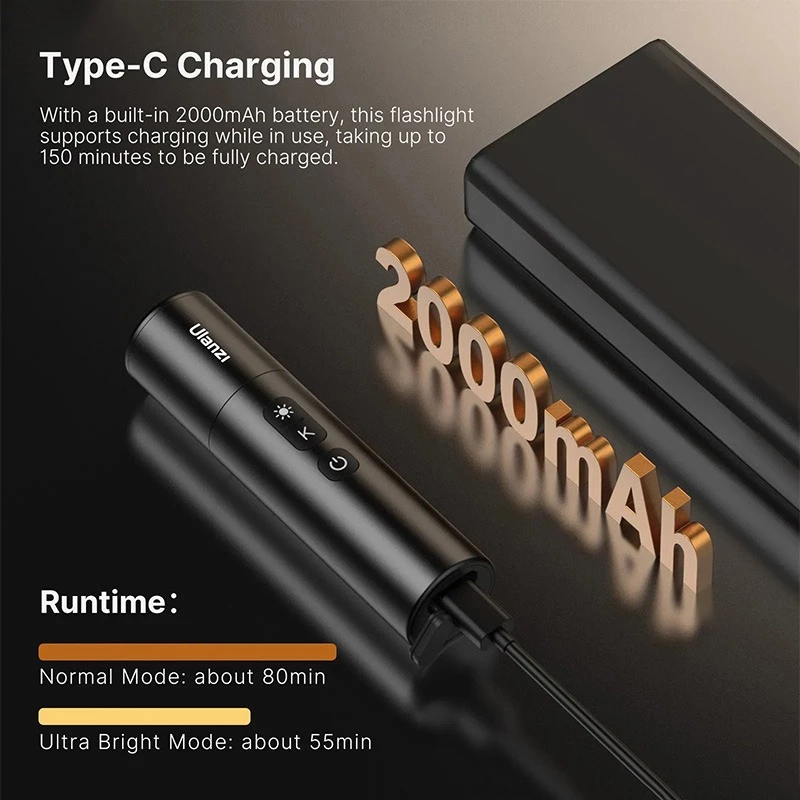 ✔ Pin Luthium dung lượng 2000mAh với cổng sạc Type-c thời gian sử dụng lên đến 80 phút (ở chế độ thường) và 55 phút (ở chế độ siêu sáng). Thời gian sạc đầy 150 phút.